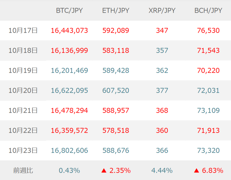 その後は様々な思惑が交錯するなか、一時BTC=114,000ドル(約1,738万円)付近まで急騰する場面も見られたが、直後に急落し、乱高下する展開となった。高市新政権の誕生で日経平均株価が5万円に迫った一方で、高騰が続いていた金価格が急落し、過去最大の下げ幅を記録。米中首脳会談の実現をめぐるトランプ大統領の発言にも相場が左右され、不安定な値動きが続いた。