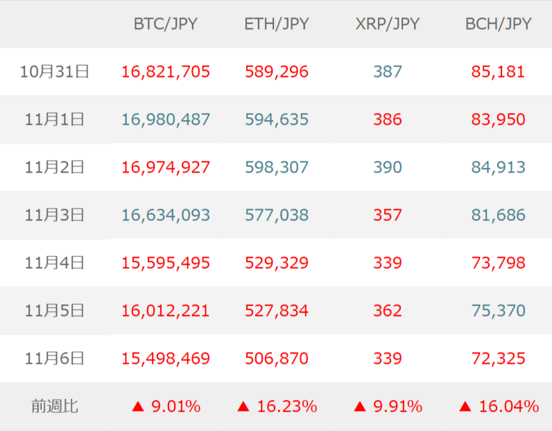 週初、前週のFOMC後にパウエル議長が12月の追加利下げについて慎重な姿勢を示したことで、金利先高観が意識され、ビットコインは軟調に推移した。ただし、短期的な売られすぎ感や米国株の自律反発を背景に、一時BTC=110,000(約1,694)ドルを回復した。